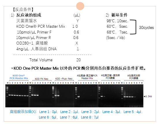 東洋紡産(chǎn)品KOD OneTM PCR Master Mix/ KOD OneTM PCR Master Mix -Blue-(Code:KMM-101/KMM-201)因其對土壤腐殖酸的高度耐受而廣受好評。并且在含有(yǒu)腐殖酸的人類基因組模闆下,都可(kě)以輕松實現HBg基因的擴增。