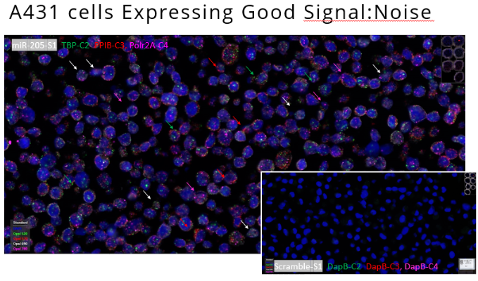 得益于ACD專利的探針設計及信号放大技(jì )術,小(xiǎo)RNA分(fēn)子及mRNA分(fēn)子的信号最終都可(kě)獲得高信噪比。下圖展示在細胞片中(zhōng)對miR-205和3個mRNA的陽性對照探針及陰性對照探針的檢測。陽性對照中(zhōng)各個通道上的信号點清晰,陰性對照中(zhōng)全片非常幹淨,體(tǐ)現出方法的高特異性。