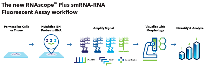 在腫瘤、神經、代謝(xiè)等領域,非編碼小(xiǎo)RNA作(zuò)為(wèi)一類調節性RNA分(fēn)子,越來越多(duō)受到研究人員的關注,它們在一些疾病的發生發展過程中(zhōng)可(kě)能(néng)具(jù)有(yǒu)關鍵性作(zuò)用(yòng)。同時,由于小(xiǎo)RNA分(fēn)子作(zuò)為(wèi)一類基因表達調節性因子,在基因治療領域也具(jù)有(yǒu)很(hěn)大潛力。針對于miRNA、siRNA、ASO等這類分(fēn)子的原位檢測,可(kě)以使用(yòng)miRNAscope實現,但同時檢測調節性分(fēn)子以及被調節的靶标RNA分(fēn)子表達變化,也具(jù)有(yǒu)非常廣泛的需求。為(wèi)此,ACD日前推出了RNAscope Plus技(jì )術,将對小(xiǎo)RNA的檢測和mRNA的檢測結合起來,可(kě)以實現同一張切片上同時對1個miRNA/siRNA/ASO和最多(duō)3個mRNA分(fēn)子進行熒光檢測。